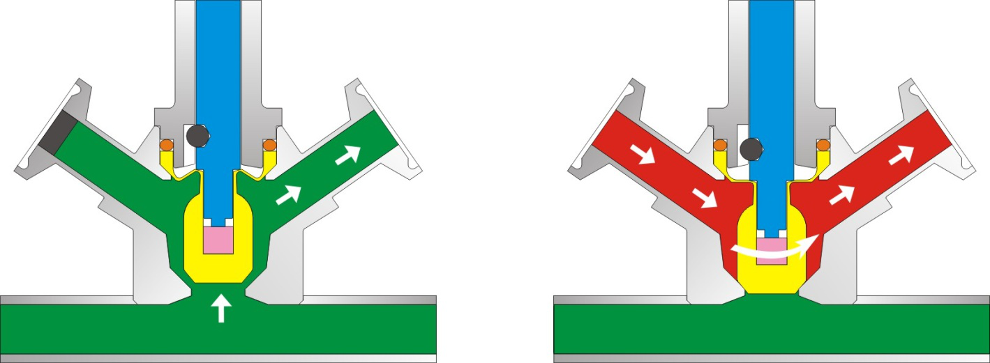 該款無菌取樣閥主要分為手輪、支架、閥芯、鋼珠、閥體、隔膜密封圈這幾種部件。當處于關閉狀態時,依靠順時針旋轉手輪推動閥芯,由閥芯將密封膠頭壓緊在閥體物料進口處,達到密封效果;如果需要取樣時,從其中一個(一般是下方的)取樣口通入蒸汽或其它殺菌介質,將整個樣品室內充滿并從另一個取樣口導出,經過一定時間的作用后使樣品室和取樣口處于無菌狀態;然后通過逆時針旋轉手輪,收拉閥芯,使得密封膠頭從閥體物料進口處脫離,從而使樣品從罐內經過樣品室流出,并從取樣口收集;取樣完成后,順時針旋轉手輪推動閥芯,通過閥芯再次將密封膠頭壓緊在閥體物料進口處;通入潔凈水將樣品室內的殘液排出(如果是樣品為無菌水等較干凈的介質時,這一步可以省略),然后注入殺菌介質進行密封留存,待下一次取樣。(頂部視窗帶有開關位置顯示)
